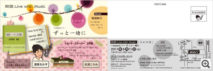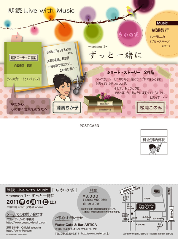 予定していた日が偶然にも震災から丁度3ヶ月。それぞれが色々な思いを抱えている今だからこそ胸に響く言葉を優しいハーモニカの生演奏にのせて朗読します。